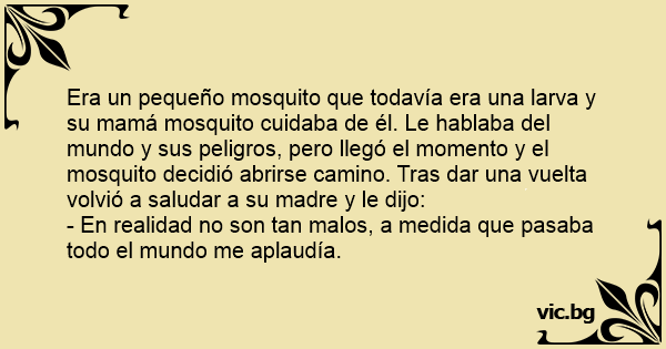 Era un pequeño mosquito que todavía era una larva y su mamá mosquito cuidaba de él. Le hablaba del mundo y sus peligros, pero llegó el momento y el mosquito decidió abrirse camino. Tras dar una vuelta volvió a saludar a su madre y le dijo: