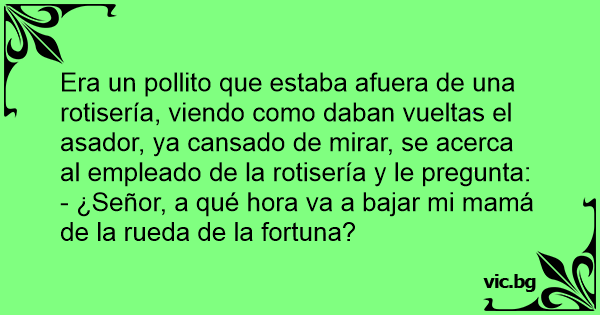 Era un pollito que estaba afuera de una rotisería, viendo como daban vueltas el asador, ya cansado de mirar, se acerca al empleado de la rotisería y le pregunta:
