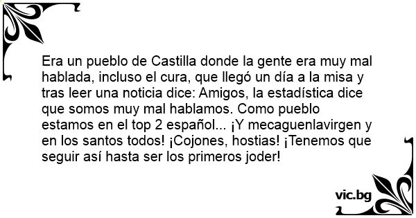 Era un pueblo de Castilla donde la gente era muy mal hablada, incluso el cura, que llegó un día a la misa y tras leer una noticia dice: Amigos, la estadística dice que somos muy mal hablamos. Como pueblo estamos en el top 2 español... ¡Y mecaguenlavirgen y en los santos todos! ¡Соjоnеs, hostias! ¡Tenemos que seguir así hasta ser los primeros jоdеr!