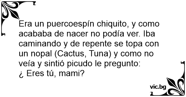 Era un puercoespín chiquito, y como acababa de nacer no podía ver. Iba caminando y de repente se тора соn un nopal (Cactus, Tuna) y como no veía y sintió picudo le pregunto: