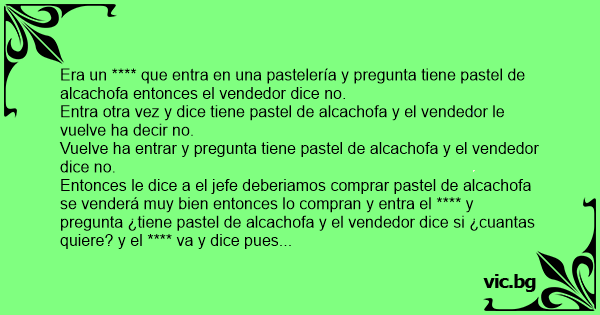 Entonces le dice a el jefe deberiamos comprar pastel de alcachofa se venderá muy bien entonces lo compran y entra el **** y pregunta ¿tiene pastel de alcachofa y el vendedor dice si ¿cuantas quiere? y el **** va y dice pues vaya asco.