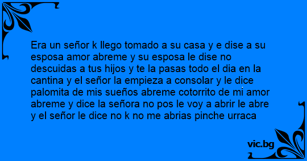 Era un señor k llego tomado a su casa y e dise a su esposa amor abreme y su esposa le dise no descuidas a tus hijos y te la pasas todo el dia en la cantina y el señor la empieza a consolar y le dice palomita de mis sueños abreme cotorrito de mi amor abreme y dice la señora no pos le voy a abrir le abre y el señor le dice no k no me abrias рinсhе urraca