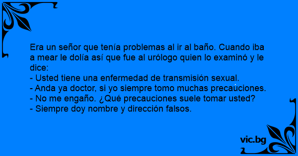 Era un señor que tenía problemas al ir al baño. Cuando iba a mear le dolía así que fue al urólogo quien lo examinó y le dice: