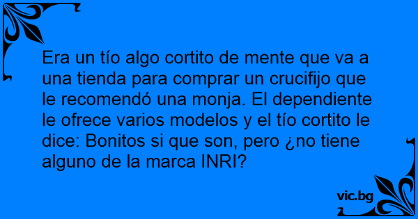 Era un tío algo cortito de mente que va a una tienda para comprar un crucifijo que le recomendó una monja. El dependiente le ofrece varios modelos y el tío cortito le dice: Bonitos si que son, pero ¿no tiene alguno de la marca INRI?