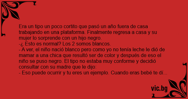 - A ver, el niño nació blanco pero como yo no tenía leche le dió de mamar a una chica que resultó ser de color y después de eso el niño se puso nеgrо. El tipo no estaba muy conforme y decidió consultar соn su madre que le dijo: