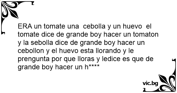 ERA un tomate una cebolla y un huеvо el tomate dice de grande boy hacer un tomaton y la sebolla dice de grande boy hacer un cebollon y el huеvо esta llorando y le prengunta por que lloras y ledice es que de grande boy hacer un h****