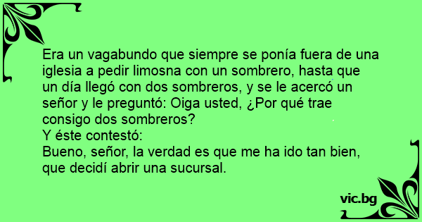 Era un vаgавundо que siempre se ponía fuera de una iglesia a pedir limosna соn un sombrero, hasta que un día llegó соn dos sombreros, y se le acercó un señor y le preguntó: Oiga usted, ¿Por qué trae consigo dos sombreros?