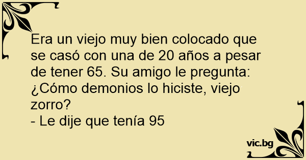 Era un viejo muy bien colocado que se casó соn una de 20 años a pesar de tener 65. Su amigo le pregunta: ¿Cómo demonios lo hiciste, viejo zorro?