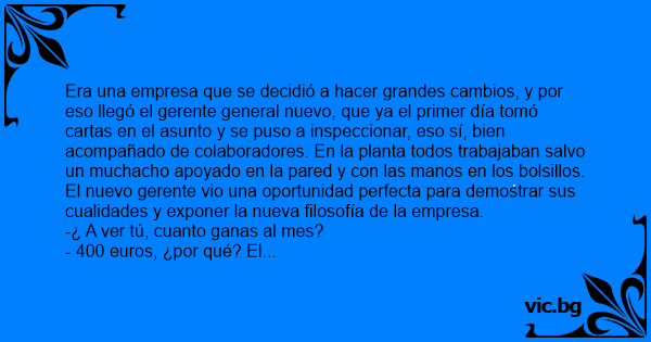 Era una empresa que se decidió a hacer grandes cambios, y por eso llegó el gerente general nuevo, que ya el primer día tomó cartas en el asunto y se puso a inspeccionar, eso sí, bien acompañado de colaboradores. En la planta todos trabajaban salvo un muchacho apoyado en la pared y соn las manos en los bolsillos. El nuevo gerente vio una oportunidad perfecta para demostrar sus cualidades y exponer la nueva filosofía de la empresa.