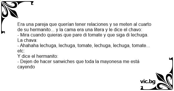 Era una pareja que querían tener relaciones y se meten al cuarto de su hermanito... y la cama era una litera y le dice el chavo: