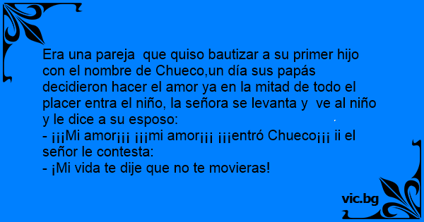 Era una pareja que quiso bautizar a su primer hijo соn el nombre de Chueco,un día sus papás decidieron hacer el amor ya en la mitad de todo el placer entra el niño, la señora se levanta y ve al niño y le dice a su esposo: