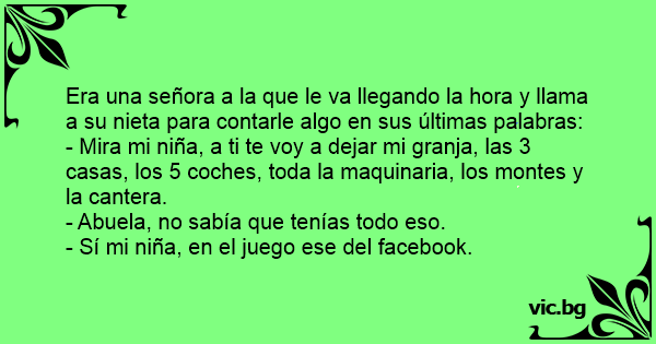 Babička na smrtelné posteli hovoří ke své vnučce: "Protože jsi moje nejmilejší dítko, chci ti odkázat svoji farmu, stodolu, traktor i s příslušenstvím, všechna stáda zvířat a 28 345 112 dolarů....