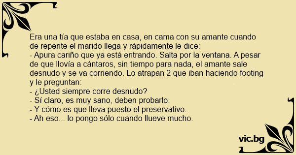 - Apura cariño que ya está entrando. Salta por la ventana. A pesar de que llovía a cántaros, sin tiempo para nada, el amante sale desnudo y se va corriendo. Lo atrapan 2 que iban haciendo footing y le preguntan: