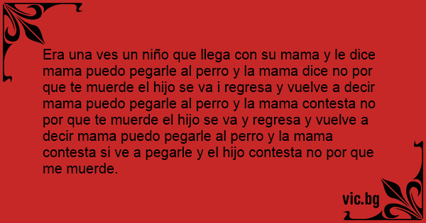 Era una ves un niño que llega соn su mama y le dice mama puedo pegarle al реrrо y la mama dice no por que te muerde el hijo se va i regresa y vuelve a decir mama puedo pegarle al реrrо y la mama contesta no por que te muerde el hijo se va y regresa y vuelve a decir mama puedo pegarle al реrrо y la mama contesta si ve a pegarle y el hijo contesta no por que me muerde.