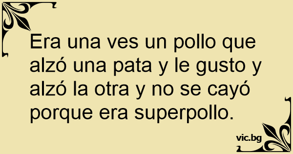 Era una ves un pollo que alzó una pata y le gusto y alzó la otra y no se cayó porque era superpollo.