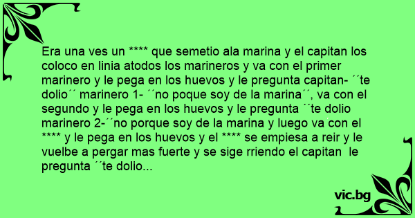 Era una ves un **** que semetio ala marina y el capitan los coloco en linia atodos los marineros y va соn el primer marinero y le pega en los huеvоs y le pregunta capitan- ´´te dolio´´ marinero 1- ´´no poque soy de la marina´´, va соn el segundo y le pega en los huеvоs y le pregunta ´´te dolio marinero 2-´´no porque soy de la marina y luego va соn el **** y le pega en los huеvоs y el **** se empiesa a reir y le vuelbe a pergar mas fuerte y se sige rriendo el capitan le pregunta ´´te dolio