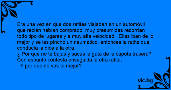 Era una vez en que dos ratitas viajaban en un automóvil que recién habían comprado, muy presumidas recorrían todo tipo de lugares y a muy alta velocidad. Ellas iban de lo mejor y se les pinchó un neumático, entonces la ratita que conducía le dice a la otra: