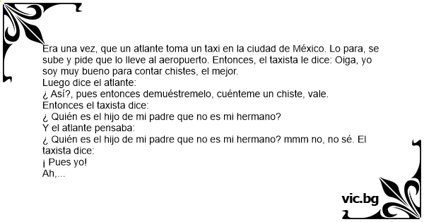Era una vez, que un atlante toma un taxi en la ciudad de México. Lo para, se sube y pide que lo lleve al aeropuerto. Entonces, el taxista le dice: Oiga, yo soy muy bueno para contar chistes, el mejor.