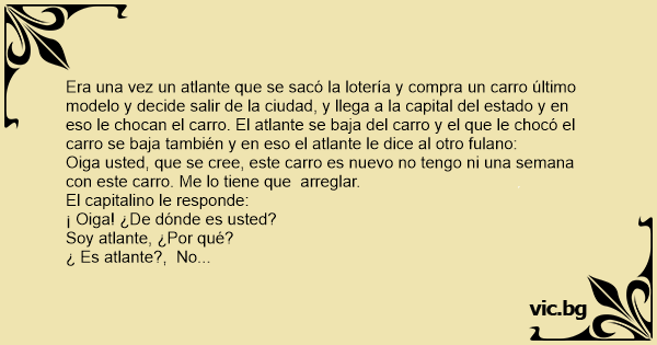 Era una vez un atlante que se sacó la lotería y compra un carro último modelo y decide salir de la ciudad, y llega a la capital del estado y en eso le chocan el carro. El atlante se baja del carro y el que le chocó el carro se baja también y en eso el atlante le dice al otro fulano: