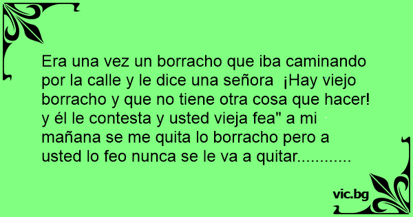 Era una vez un borracho que iba caminando por la calle y le dice una señora ¡Hay viejo borracho y que no tiene otra cosa que hacer! y él le contesta y usted vieja fea" a mi mañana se me quita lo borracho pero a usted lo feo nunca se le va a quitar............
