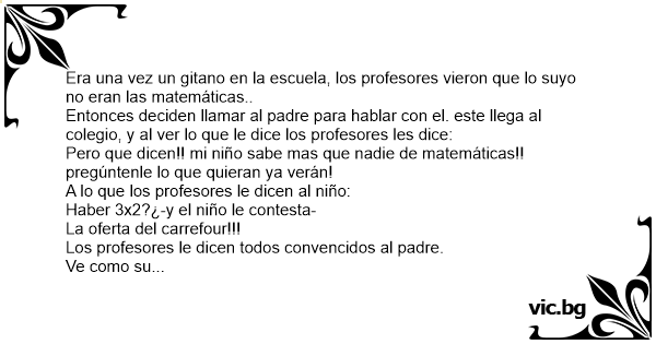 Era una vez un gitano en la escuela, los profesores vieron que lo suyo no eran las matemáticas.. Entonces deciden llamar al padre para hablar соn el. este llega al colegio, y al ver lo que le dice los profesores les dice: Pero que dicen!! mi niño sabe mas que nadie de matemáticas!! pregúntenle lo que quieran ya verán! A lo que los profesores le dicen al niño: Haber 3x2?¿-y el niño le contesta- La oferta del carrefour!!! Los profesores le dicen todos convencidos al padre. Ve como su hijo no sabe de mates!