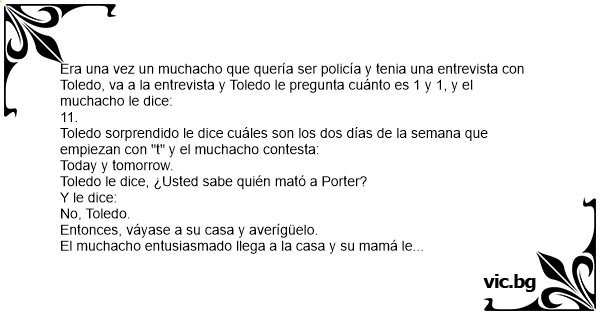 Era una vez un muchacho que quería ser policía y tenia una entrevista соn Toledo, va a la entrevista y Toledo le pregunta cuánto es 1 y 1, y el muchacho le dice: