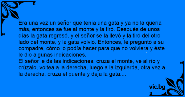 El señor le da las indicaciones, cruza el monte, ve al río y crúzalo, voltea a la derecha, luego a la izquierda, otra vez a la derecha, cruza el puente y deja la gata.