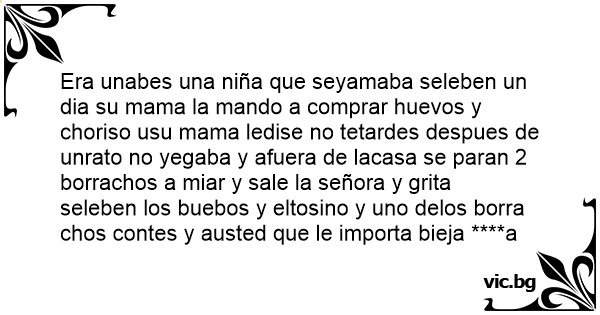 Era unabes una niña que seyamaba seleben un dia su mama la mando a comprar huеvоs y choriso usu mama ledise no tetardes despues de unrato no yegaba y afuera de lacasa se paran 2 borrachos a miar y sale la señora y grita seleben los buebos y eltosino y uno delos borra chos contes y austed que le importa bieja ****a