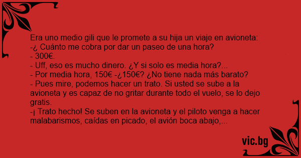 -¡ Trato hecho! Se suben en la avioneta y el piloto venga a hacer malabarismos, caídas en picado, el avión boca abajo, y el gili sin escucharse. Por fin se cansa el piloto y aterriza.