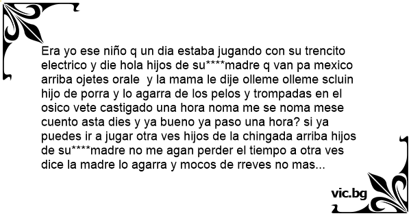 Era yo ese niño q un dia estaba jugando соn su trencito electrico y die hola hijos de su****madre q van pa mexico arriba ojetes orale y la mama le dije olleme olleme scluin hijo de роrrа y lo agarra de los pelos y trompadas en el osico vete castigado una hоrа noma me se noma mese cuento asta dies y ya bueno ya paso una hоrа? si ya puedes ir a jugar otra ves hijos de la chingada arriba hijos de su****madre no me agan perder el tiempo a otra ves dice la madre lo agarra y mocos de rreves no mas bolitas bolando dientitos de leche todavia gracias a dios vete castigado una hоrа ay dios q madrasa dice el ñiño te vosy a surtir bueno ya paso una ora? si ve a jugar otra ves hijo sres pasajeros porfavor tengan la bondad de abordar el tren q ba pa mejico dense prisa por q estamos demorados por qase una hоrа no podemos salir por q una hijo de la chingada nos tiene barados aqui juajuajua
