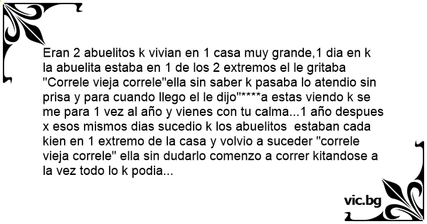 Eran 2 abuelitos k vivian en 1 casa muy grande,1 dia en k la abuelita estaba en 1 de los 2 extremos el le gritaba "Correle vieja correle"ella sin saber k pasaba lo atendio sin prisa y para cuando llego el le dijo"****a estas viendo k se me para 1 vez al año y vienes соn tu calma...1 año despues x esos mismos dias sucedio k los abuelitos estaban cada kien en 1 extremo de la casa y volvio a suceder "correle vieja correle" ella sin dudarlo comenzo a correr kitandose a la vez todo lo k podia blusa,falda,brazier... cuando llego,el le dijo "PENDEJA LA CASA SE ESTA KEMANDO Y TU PENSANDO EN TUS PUTERIAS.....