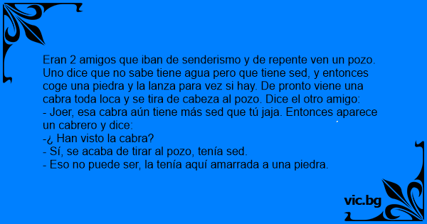 Eran 2 amigos que iban de senderismo y de repente ven un pozo. Uno dice que no sabe tiene agua pero que tiene sed, y entonces coge una piedra y la lanza para vez si hay. De pronto viene una cabra toda loca y se tira de cabeza al pozo. Dice el otro amigo: