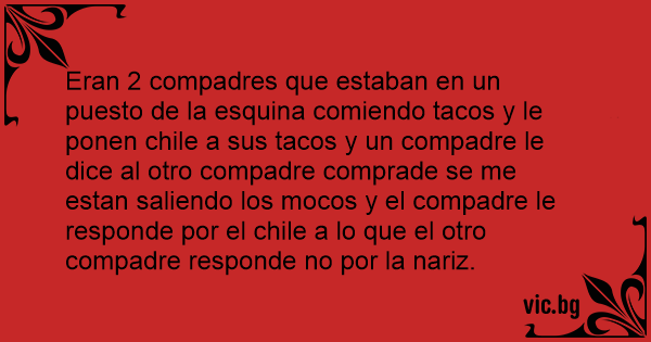 Eran 2 compadres que estaban en un puesto de la esquina comiendo tacos y le ponen chile a sus tacos y un compadre le dice al otro compadre comprade se me estan saliendo los mocos y el compadre le responde por el chile a lo que el otro compadre responde no por la nariz.