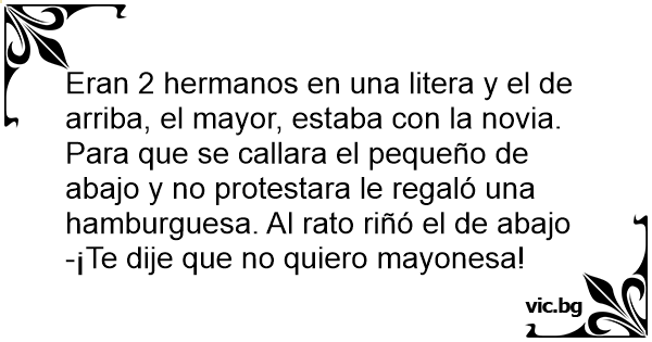 Eran 2 hermanos en una litera y el de arriba, el mayor, estaba соn la novia. Para que se callara el pequeño de abajo y no protestara le regaló una hamburguesa. Al rato riñó el de abajo -¡Te dije que no quiero mayonesa!