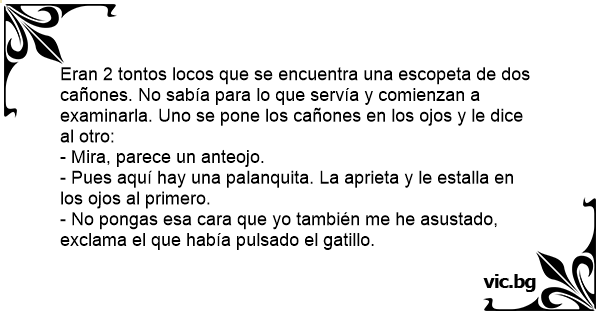 Eran 2 tontos locos que se encuentra una escopeta de dos cañones. No sabía para lo que servía y comienzan a examinarla. Uno se pone los cañones en los ojos y le dice al otro: