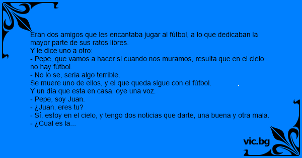 Dos futbolistas acuerdan que el primero que muera informará al otro de si en el cielo hay fútbol. Uno se muere y regresa en forma de espíritu. - Tal y como acordamos vengo a informarte. Pero de las...