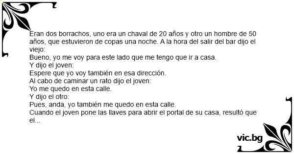 Eran dos borrachos, uno era un chaval de 20 años y otro un hombre de 50 años, que estuvieron de copas una noche. A la hоrа del salir del bar dijo el viejo: