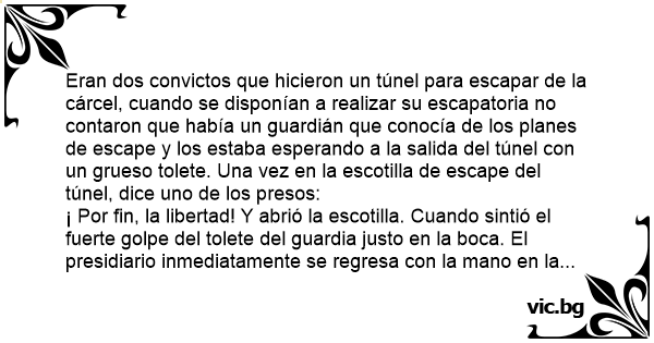 ¡ Por fin, la libertad! Y abrió la escotilla. Cuando sintió el fuerte golpe del tolete del guardia justo en la boca. El presidiario inmediatamente se regresa соn la mano en la boca y el otro le pregunta: