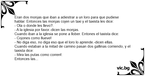 Eran dos monjas que iban a adiestrar a un loro para que pudiese hablar. Entonces las monjas cojen un taxi y el taxista les dice:
