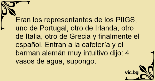 Eran los representantes de los PIIGS, uno de Portugal, otro de Irlanda, otro de Italia, otro de Grecia y finalmente el español. Entran a la cafetería y el barman alemán muy intuitivo dijo: 4 vasos de agua, supongo.