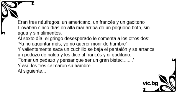 Y valientemente saca un cuchillo se baja el pantalón y se arranca un pedazo de nalga y les dice al francés y al gaditano: