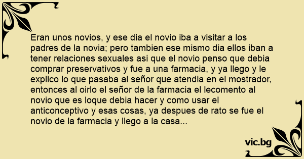 Eran unos novios, y ese dia el novio iba a visitar a los padres de la novia; pero tambien ese mismo dia ellos iban a tener relaciones sexuales asi que el novio penso que debia comprar preservativos y fue a una farmacia, y ya llego y le explico lo que pasaba al señor que atendia en el mostrador, entonces al oirlo el señor de la farmacia el lecomento al novio que es loque debia hacer y como usar el anticonceptivo y esas cosas, ya despues de rato se fue el novio de la farmacia y llego a la casa de su novia, se sentaron todos a la mesa y la madre de lanovia pidio que hicieran una oracion antes de comer, inclinaron la cabeza todos y comenzaron rezar, pasaron 5 minutos y ya habia terminado la oracion pero el novio seguia соn la cabeza inclinada, despues pasaron 10 minutos, 20, 30 y una hоrа y la novia se decidio y le dijo: