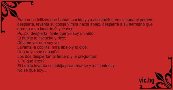Eran unos trillizos que habían nacido y ya acostaditos en su cuna el primero despierta, levanta su cobija y mira hacia abajo, despierta a su hermano que dormía a un lado de él y le dice: