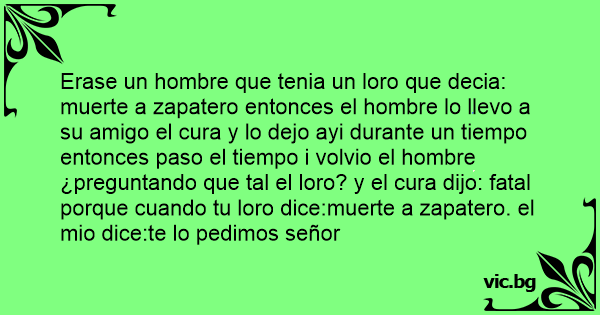 Erase un hombre que tenia un loro que decia: muerte a zapatero entonces el hombre lo llevo a su amigo el cura y lo dejo ayi durante un tiempo entonces paso el tiempo i volvio el hombre ¿preguntando que tal el loro? y el cura dijo: fatal porque cuando tu loro dice:muerte a zapatero. el mio dice:te lo pedimos señor