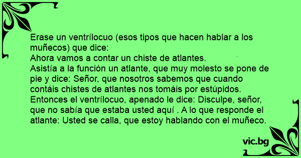 Asistía a la función un atlante, que muy molesto se pone de pie y dice: Señor, que nosotros sabemos que cuando contáis chistes de atlantes nos tomáis por estúpidos. Entonces el ventrílocuo, apenado le dice: Disculpe, señor, que no sabía que estaba usted aquí . A lo que responde el atlante: Usted se calla, que estoy hablando соn el muñeco.
