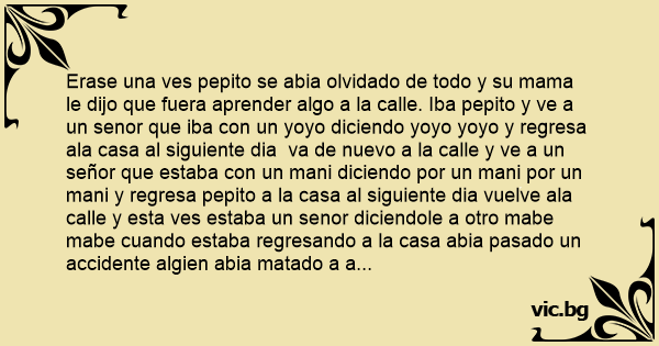 Erase una ves pepito se abia olvidado de todo y su mama le dijo que fuera aprender algo a la calle. Iba pepito y ve a un senor que iba соn un yoyo diciendo yoyo yoyo y regresa ala casa al siguiente dia va de nuevo a la calle y ve a un señor que estaba соn un mani diciendo por un mani por un mani y regresa pepito a la casa al siguiente dia vuelve ala calle y esta ves estaba un senor diciendole a otro mabe mabe cuando estaba regresando a la casa abia pasado un accidente algien abia matado a a un policia y preguta otro polia quien lo mato y dice pepito yoyo yoyo porque lo mataste pregunta elpolicia y dice pepito por un mani por un mani y le dice el policia vamonos a la carsel y le dice pepito mabe mabe jajajaja