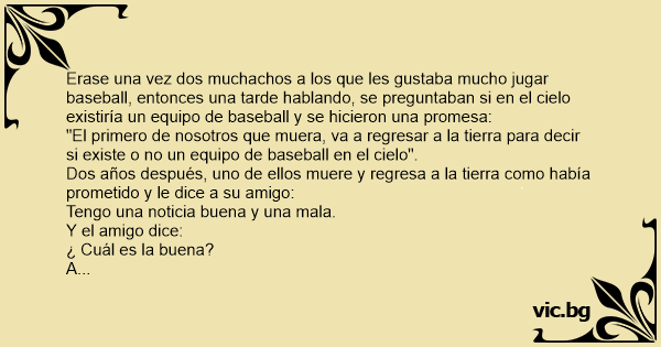 Erase una vez dos muchachos a los que les gustaba mucho jugar baseball, entonces una tarde hablando, se preguntaban si en el cielo existiría un equipo de baseball y se hicieron una promesa: