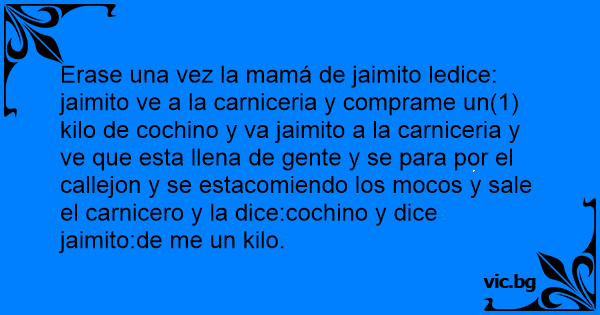 Erase una vez la mamá de jaimito ledice: jaimito ve a la carniceria y comprame un(1) kilo de cochino y va jaimito a la carniceria y ve que esta llena de gente y se para por el callejon y se estacomiendo los mocos y sale el carnicero y la dice:cochino y dice jaimito:de me un kilo.