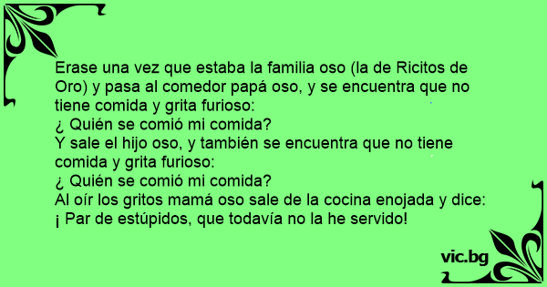 Erase una vez que estaba la familia oso (la de Ricitos de Oro) y pasa al comedor papá oso, y se encuentra que no tiene comida y grita furioso: