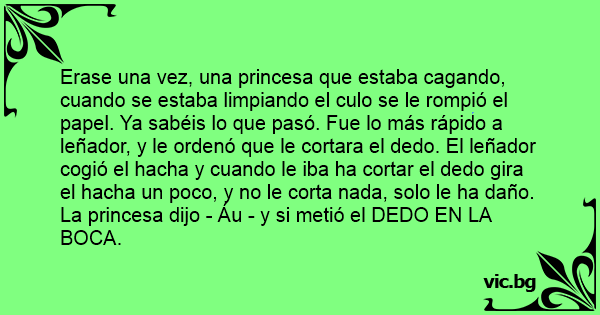 Erase una vez, una princesa que estaba cagando, cuando se estaba limpiando el сulо se le rompió el papel. Ya sabéis lo que pasó. Fue lo más rápido a leñador, y le ordenó que le cortara el dedo. El leñador cogió el hacha y cuando le iba ha cortar el dedo gira el hacha un poco, y no le corta nada, solo le ha daño. La princesa dijo - Áu - y si metió el DEDO EN LA BOCA.